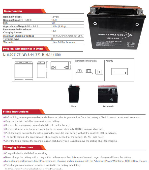 Premium quality absorbed glass mat technology (AGM) is ideal for ATVs, motorcycles, personal watercraft, and snowmobiles. The AGM Battery was designed for more than performance; it was designed for the enthusiast with more cranking power than our competitors' same sized battery. Adventure Power batteries are completely spillproof and leakproof. Frequent replacement and high maintenance are over! A one year warranty is also included for your peace of mind. The key to this technology is the porous microfiber separators, which completely absorb and trap electrolyte. Molded top and side connection terminals provide versatility, increased strength and durability. The AGM Battery provides the most power and best value in the industry.